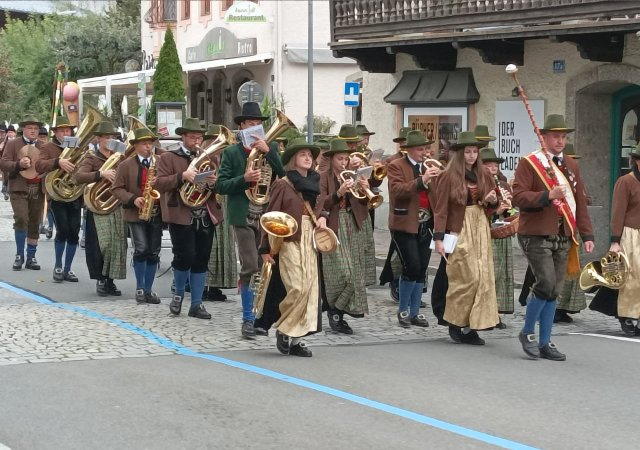 Selbst eine Kaltfront konnte an diesem Sonntag die gute Stimmung bei unserer Erntedankfeier nicht trüben. Die Segnung der farbenprächtigen wunderschönen Erntedankkrone am Salzburger Platz, anschließend der Aufmarsch sämtlicher Vereine, angeführt von der Musikkapelle, verlieh dem Fest einen würdigen Auftakt. Den Gottesdienst in der bis zum letzten Sitzplatz ausgefüllten Pfarrkirche leitete unser Pfarramtsleiter Norbert Ronacher. Musikalisch wurde die Feier von der Musikkapelle und den Kindern der Volksschule umrahmt. Vor dem Segen gab es noch eine schwungvolle musikalische Überraschung: die SchülerInnen sangen gemeinsam, begleitet von der Musikkapelle, das allseits bekannte Kaprun-Lied: "Hoch auf dem Kitzsteinhorn, im Kapruner Tal....."