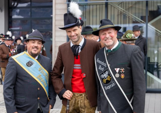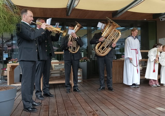 Mit „Großer Gott, wir loben Dich“ fand der feierliche Gottesdienst einen würdigen Abschluss. Vor dem Festzelt warteten die Falkenbachschützen noch mit einer Ehrensalve auf, bevor die BesucherInnen, begleitet von der Musikkapelle, gemeinsam in das festlich geschmückte Zelt einzogen, in dem die Gäste kulinarisch mit Grillhendl oder Grillwürstl mit Pommes sowie Kaffee und Kuchen verwöhnt wurden. Die Seewiesn-Musi aus Goldegg sorgte musikalisch für gute Stimmung und verstand es, bis in den späten Abend hinein die große Schar bestens zu unterhalten.