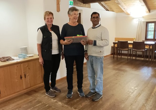 Viele Pfarrbriefverteilerinnen folgten der Einladung zu einem Kaffeenachmittag ins Meixnerhaus. Manche der Anwesenden haben über 3 Jahrzehnte die Pfarre mit dieser wertvollen Arbeit unterstützt. Nun war es an der Zeit, dafür allen "DANKE" zu sagen, allen voran Traudi Kirchlechner, die für die Leitung verantwortlich war - sowie Hermi Laireiter und Gundi Voglreiter, die immer hilfreich zur Seite standen. Die stellvertretende Obfrau des Pfarrgemeinderates, Sieglinde Hartl, dankte für die geleistete Arbeit und überreichte Blumen und Geschenke. Unser Pfarrer Ananda würdigte die Tätigkeit und bat zugleich weiterhin um Mithilfe in unserer Pfarre.