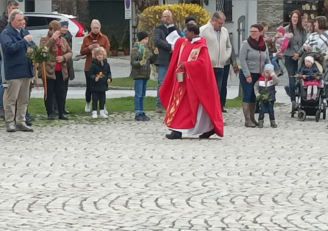 Mit Freude konnten wir in diesem Jahr wieder unsere Palmbuschen am Salzburger Platz weihen lassen sowie den Gottesdienst in der Sporthalle gemeinsam feiern. Das Bläserquartett mit Kapellmeister Thomas Gold umrahmte stimmungsvoll die Feier. Vor dem Seniorenhaus versammelten sich die BewohnerInnen und freuten sich über die Palmbuschen, die von unserer neuen Pfarrgemeinderätin, Kathrin Rainer gebunden worden waren. Vielen Dank dafür!
