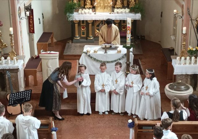 Bei strahlendem Sonnenschein konnte das Fest der Erstkommunion gefeiert werden. 19 Kinder der Volksschule durften nach einigen Wochen Vorbereitungszeit das Heilige Brot zum ersten Mal empfangen. Am Salzburger Platz wurden sie von der Musikkapelle abgeholt und feierlich auf den Kirchbichl begleitet. Beim Gottesdienst mit Pfarrer Ananda war deutlich spürbar, mit welcher Begeisterung die Kinder dabei waren. Allen ein großes "Danke", die zum Gelingen dieses wunderbaren Festes beigetragen haben.